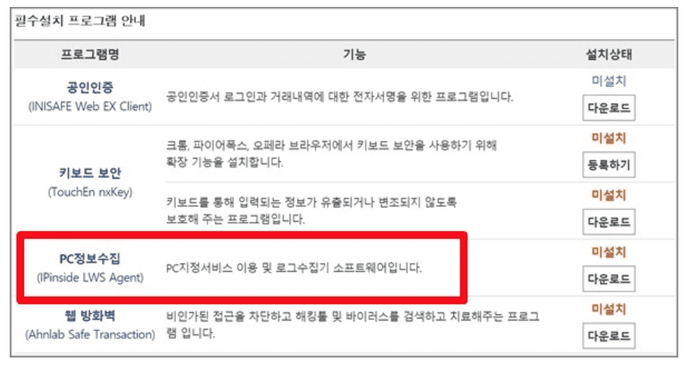 자신의 컴퓨터 사용 패턴을 분석하고 사용하지 않는 프로그램을 과감히 삭제 해어 정리를 해줄것을 권장하며 은행업무 관공서 업무가 많은분들은 IPinside LWS Agent 의 기능을 수동 정지 및 재설정 가능하니 참고하시길 바랍니다.