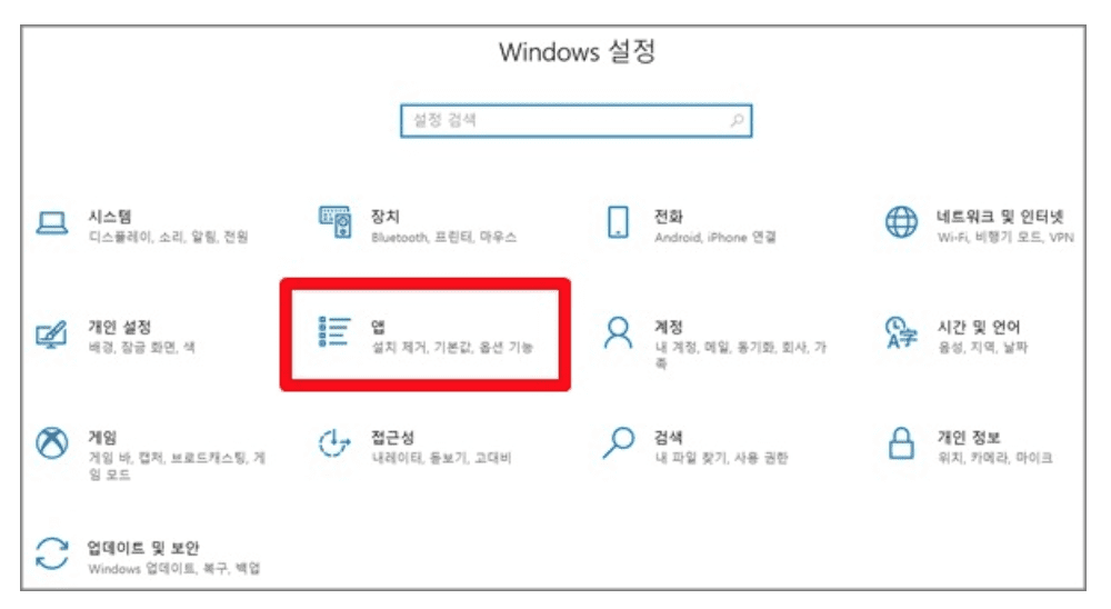 1. 윈도우 설정 메뉴 [앱] 에 들어가줍니다.