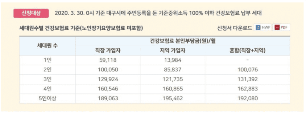 대구시는 이번 코로나 바이러스로 인해 힘들어하고 있을 지역민을 위해 지원금을 지급하고 있습니다.