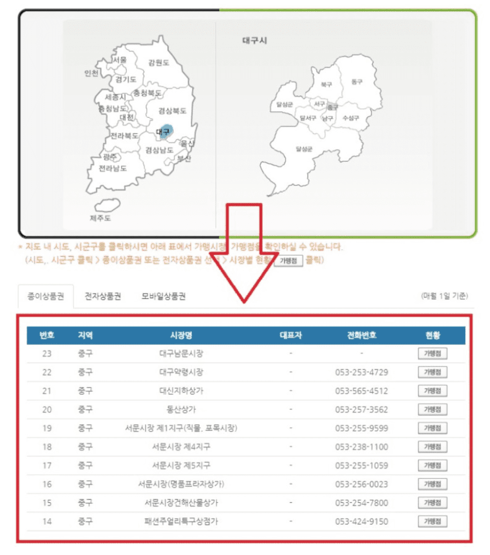 대구 경상북도내 지역 중소마트, 전통시장, 빵짐, 편의점, 서점, 병원 등에서 지용 가능 합니다.