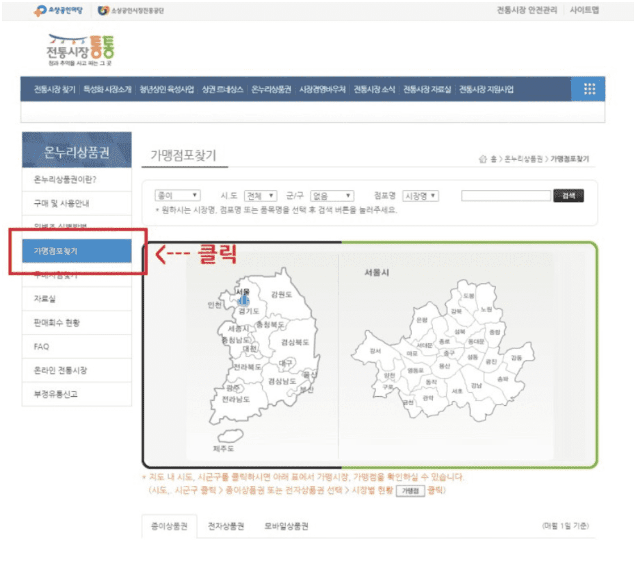 온누리상품권 - 가맹점포찾기 클릭 합니다.
