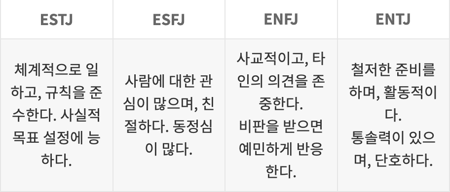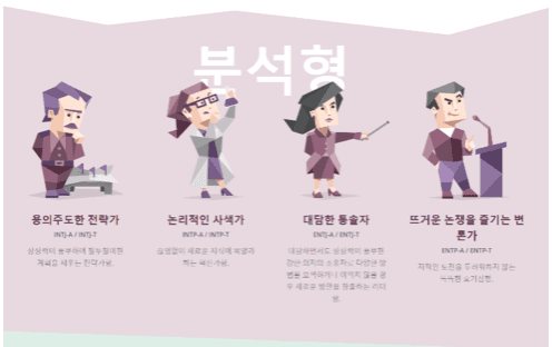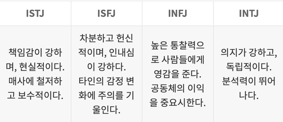 MBTI 성격 유형검사로 아래의 4가지 기준으로 16가지 형태의 심리 유형중 하나루 분류 할수 있습니다.