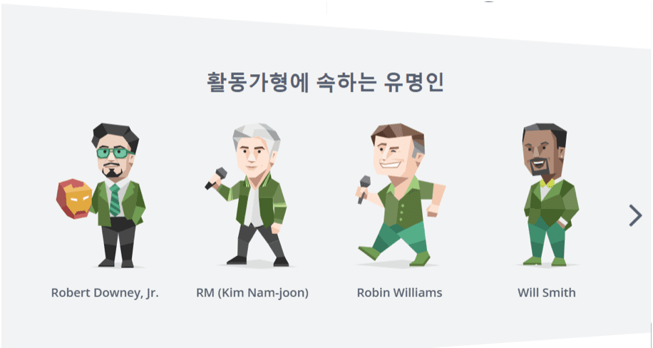 검사가 완료되었다면 자신의 성격유형 및 상세설명을 볼수 있습니다. 이밖에 자신의 성격과 동일안 세계의 유명인을 비교해볼수 있습니다.